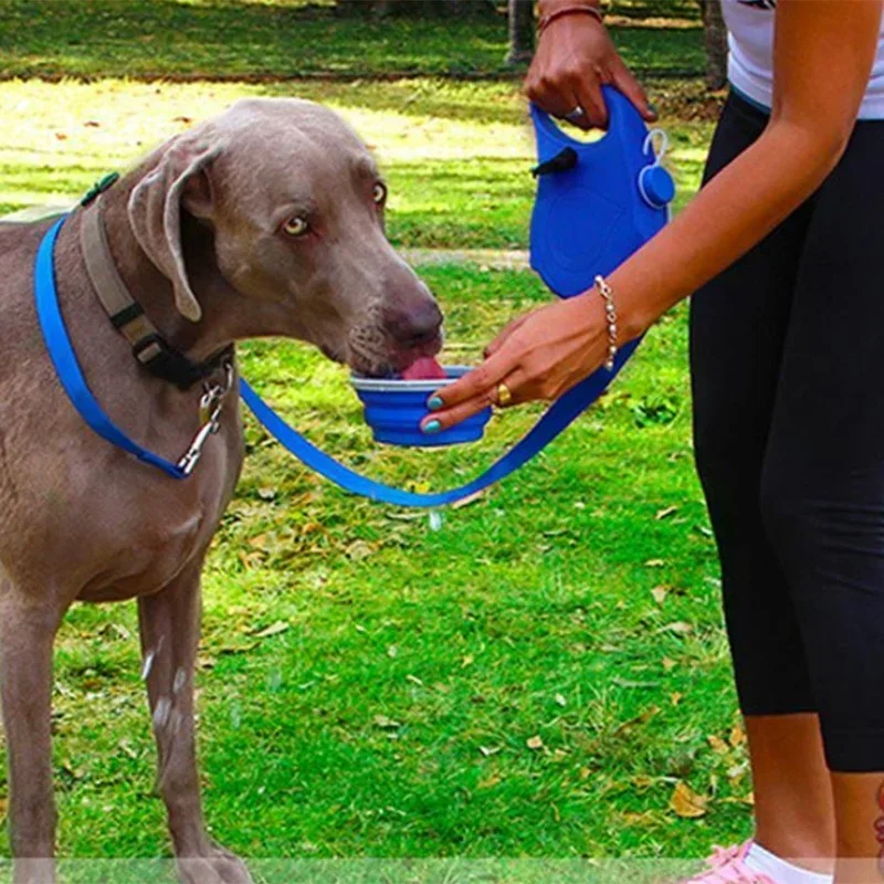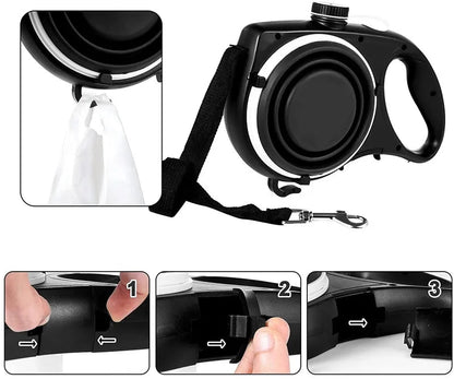 WalkEase 4-in-1 combines a strong leash, a water bottle, a collapsible bowl, and a waste bag dispenser — everything you need for convenient, hands-free walks!